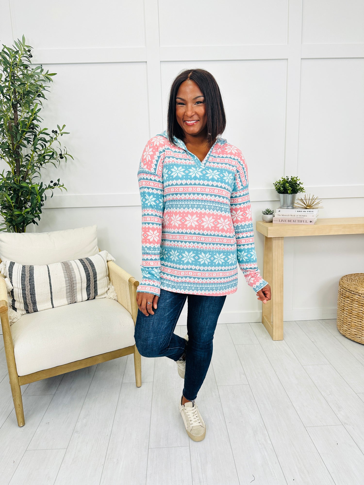 Bring a touch of holiday cheer to your wardrobe with this adorable patterned pullover. The festive hooded design instantly brightens up your look, while the split neckline adds a relaxed, flattering touch. Finished with a soft, cozy feel and a casual fit, it’s perfect for celebrating the season in comfort and style.