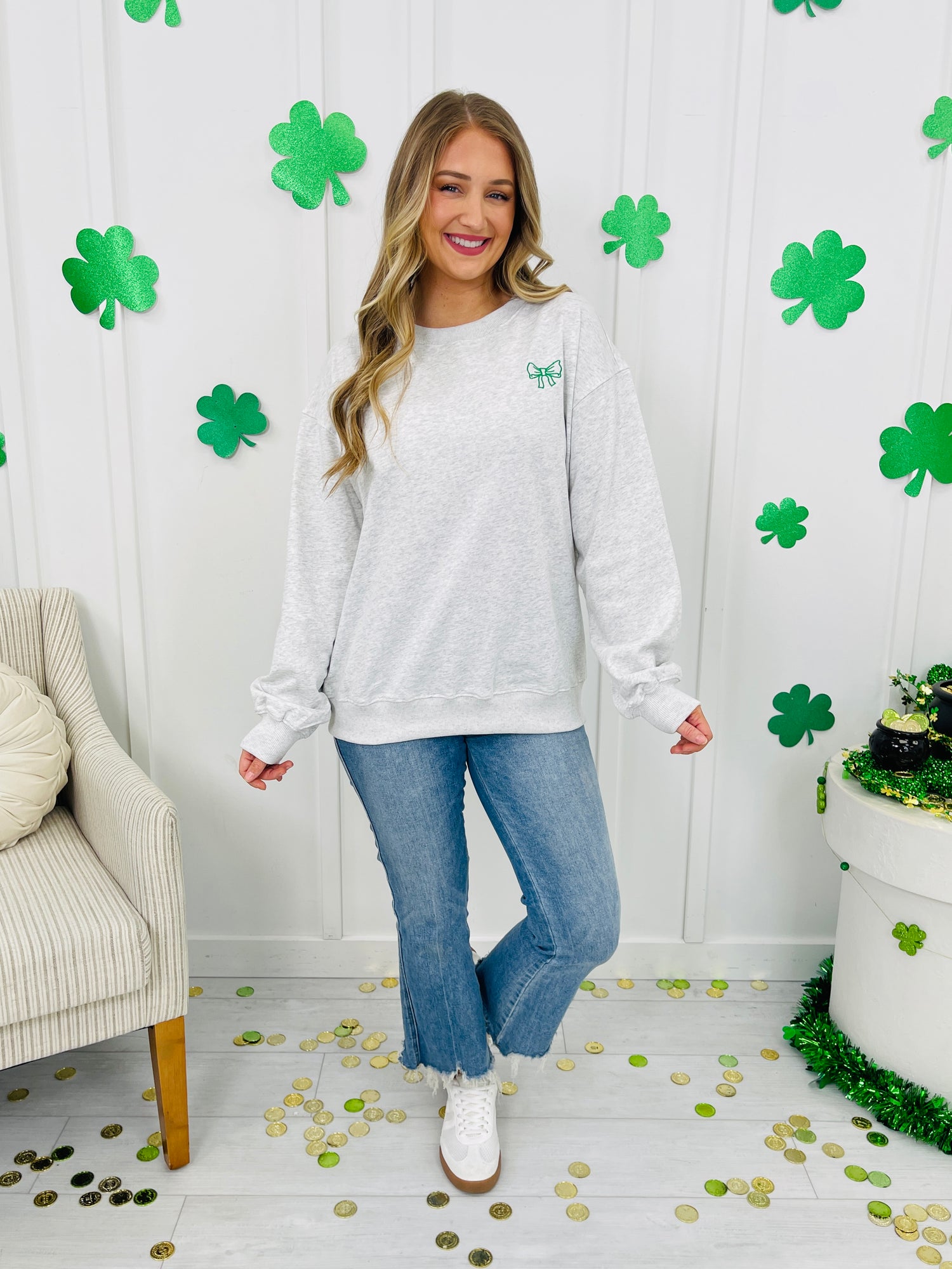 This cozy pullover brings all the lucky vibes with a sweet little green bow on the front and a statement shamrock design across the back, filled with playful St. Paddy’s icons. The easy crewneck fit makes it effortless to throw on for casual days, while the stitched details keep it looking extra special and boutique-worthy. Pair it with your favorite denim for an instant festive look that still feels cute and wearable beyond the holiday.