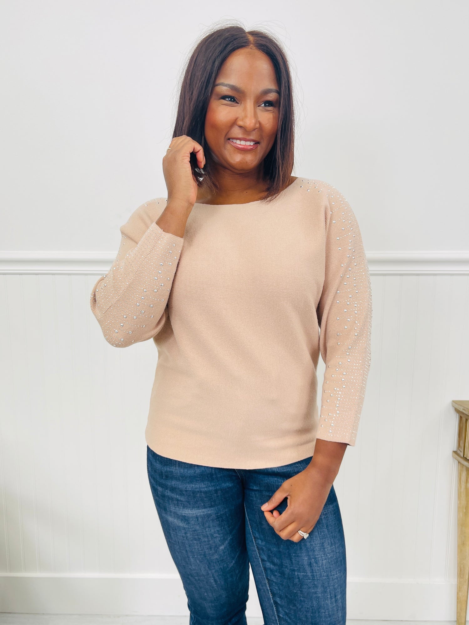 Bring easy elegance to your day with this soft knit top, finished with a graceful boat neckline and a polished straight hem. The sleeves steal the show with sparkling stud embellishments that trail from shoulder to wrist, growing denser toward the cuffs for a subtle gradient effect. A relaxed, bracelet-length sleeve adds a chic touch that pairs perfectly with denim or dress pants.