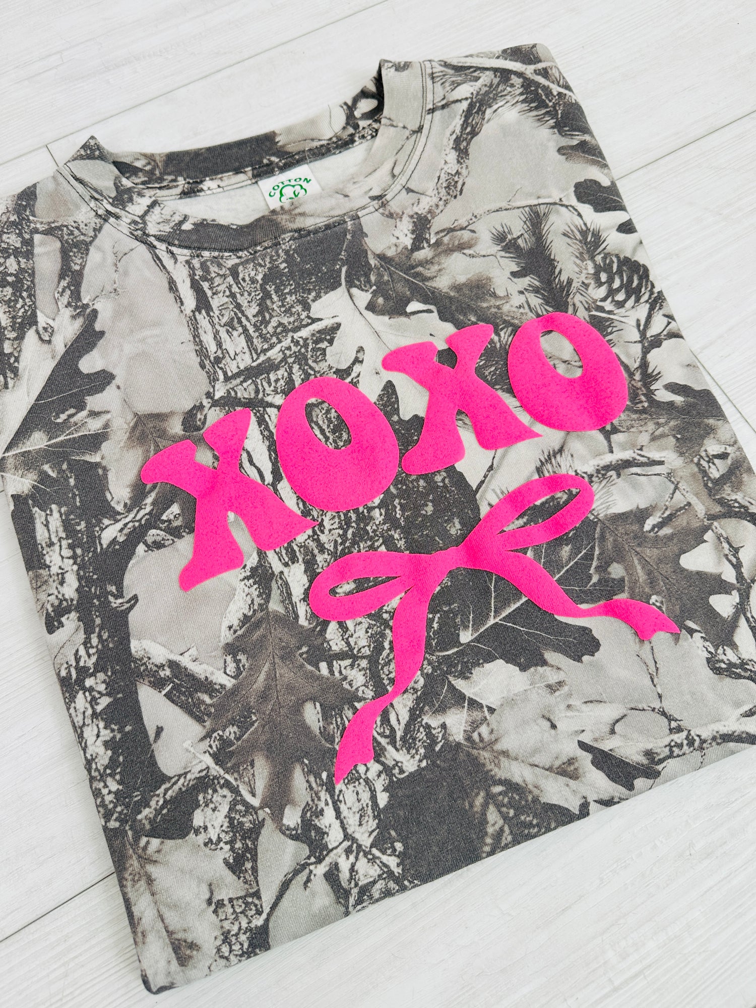 Add a fun twist to heart season in this XOXO Camo tee — a playful mix of bold, puff paint bubble lettering and vintage camo that feels trendy, unexpected, and totally eye-catching. The sweet bow detail softens the rugged print, creating the perfect balance of edgy and cute for Valentine’s fun.